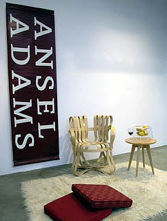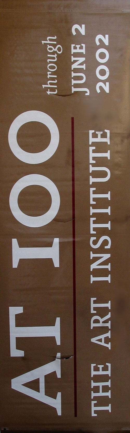 These banners show how attractive and dramatic a wall-hanging can be with text only on both sides. One side of the banner is a rich brick-red color with white text that reads, “Ansel Adams” in a large, traditional serif font. The other side reads, “At 100/The Art Institute/through June 2, 2002”, as the exhibition commemorated Adams’s centenary. This text is white on a warm taupe background.