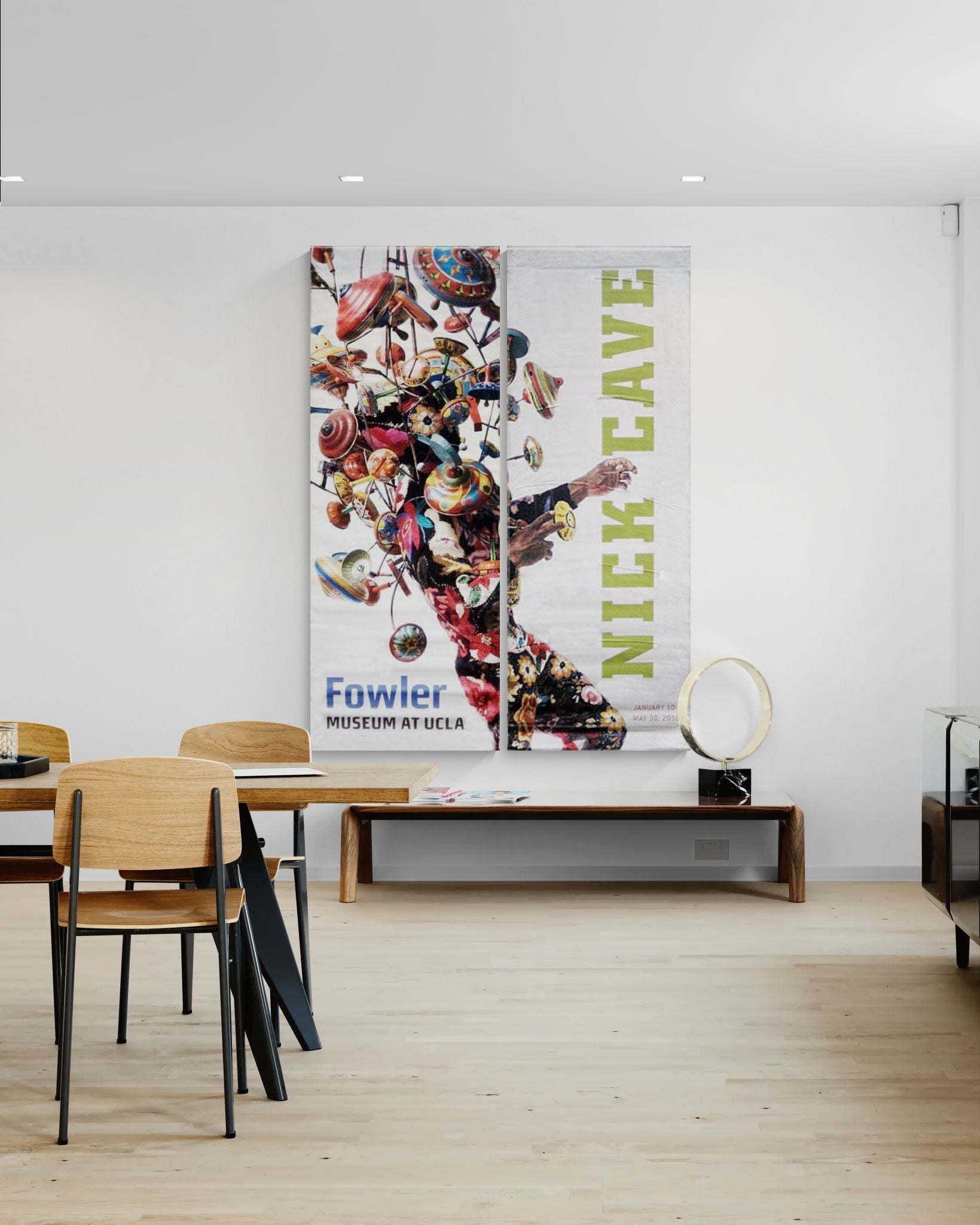 The front side of the banner is a close up of the toys and tops from the suits upper section. “Fowler Museum at UCLA” appears at the bottom in blue and black letters. The back of the banner shows a partial view of a man dancing in the suit with colorful spinning tops in the foreground. “Nick Cave” appears in large lime green letters (sideways vertical) from bottom to top, along with the exhibition’s dates.
